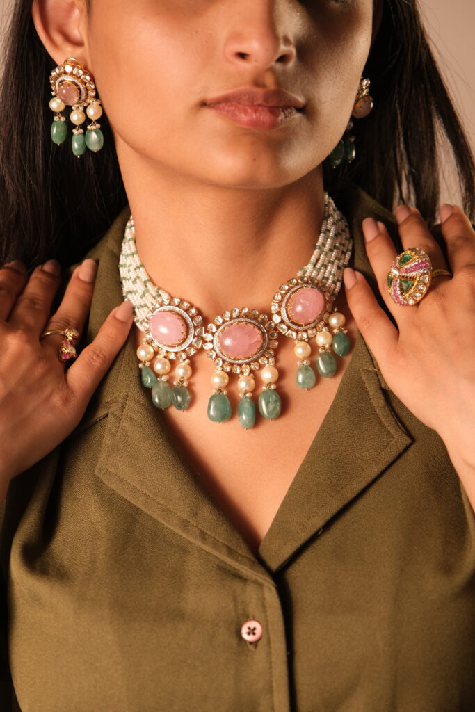 HERITAGE STYLE POLKI SET STUDDED WITH REAL CERTIFIED DIAMONDS , POLKI AND REAL STONES IN 18 KT GOLD This exquisite Heritage Style Polki Set is a celebration of timeless tradition and regal craftsmanship, meticulously handcrafted in rich 18 KT gold. Designed to reflect the grandeur of royal Indian jewelry, this stunning set is studded with […]