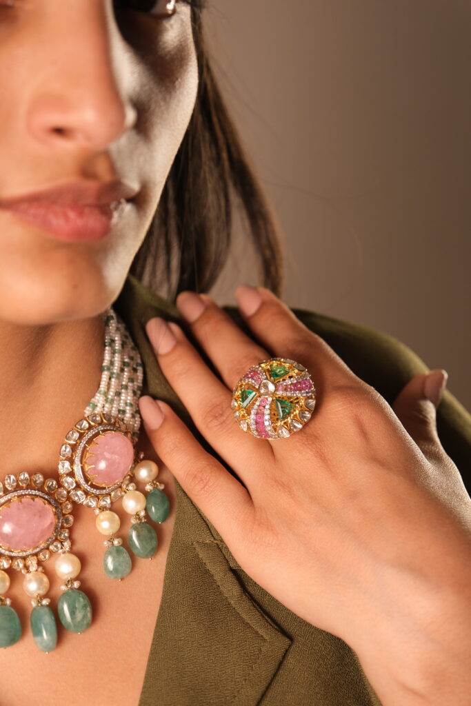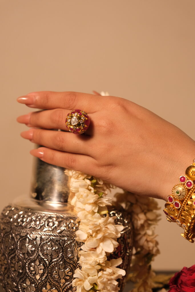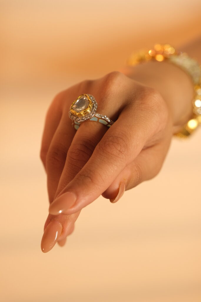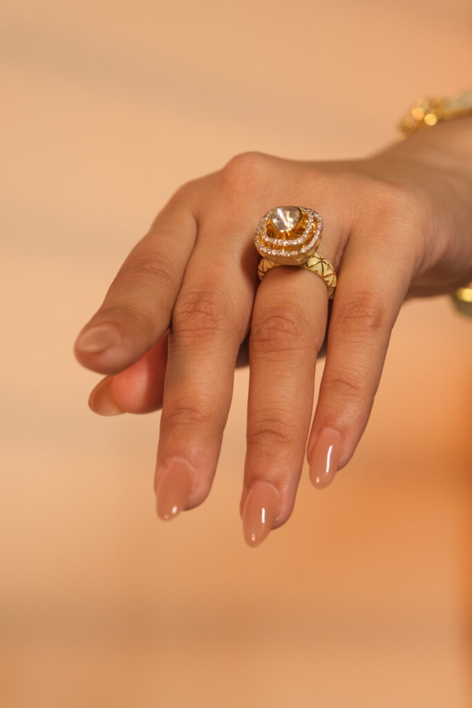 LADIES RING WITH REAL POLKI STONE MADE IN 18 KT GOLD Elegant Ladies Ring crafted in 18 KT gold, featuring a stunning real Polki stone. A perfect blend of traditional charm and refined sophistication You may also like