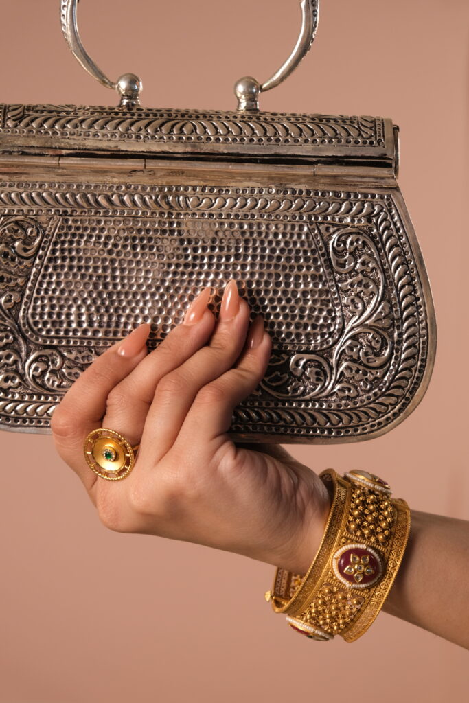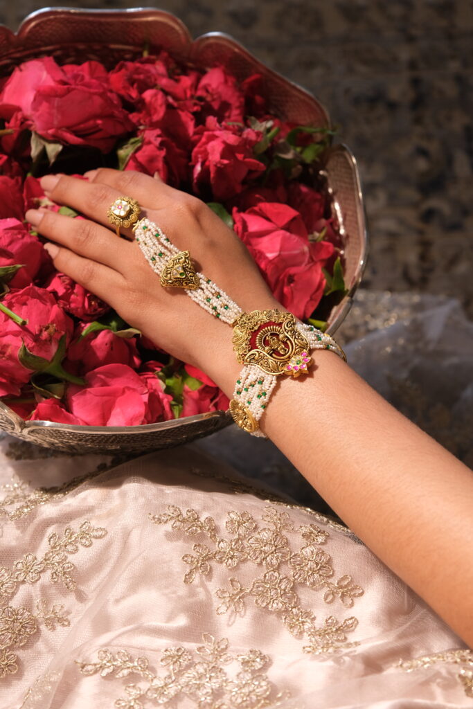 HERITAGE STYLE HAND BRACELET STUDDED WITH SEMI PRECIOUS STONE ATTACHED WITH A RING IN 22 KT GOLD This Heritage Style Hand Bracelet, crafted in 22 KT gold, is an exquisite fusion of tradition and elegance, designed to captivate attention and enhance the beauty of any hand it graces. With its intricate design, luxurious feel, and […]