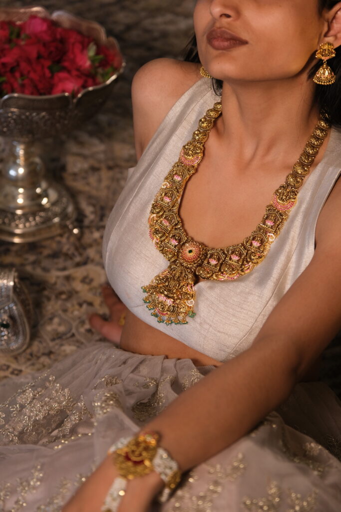 ANTIQUE RANI HAR IN SOUTH INDIAN STYLE WITH TEMPLE CARVINGS STUDDED WITH SEMI PRECIOUS STONES IN 22 KT GOLD This Antique Rani Har, crafted in 22 KT gold, is an extraordinary piece of jewelry that beautifully embodies the rich cultural heritage and artistic brilliance of traditional South Indian design. Known for its royal significance, the […]