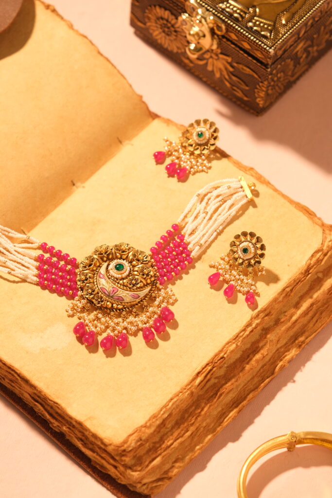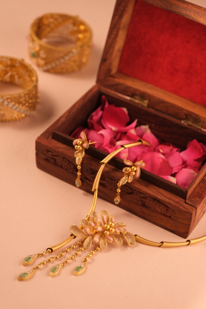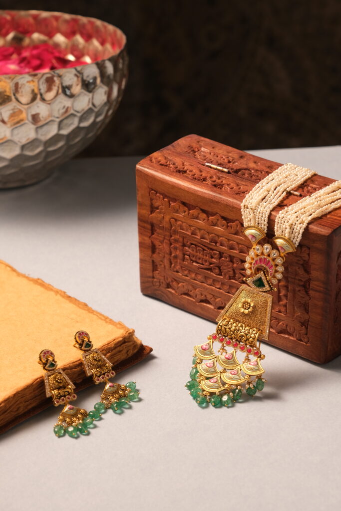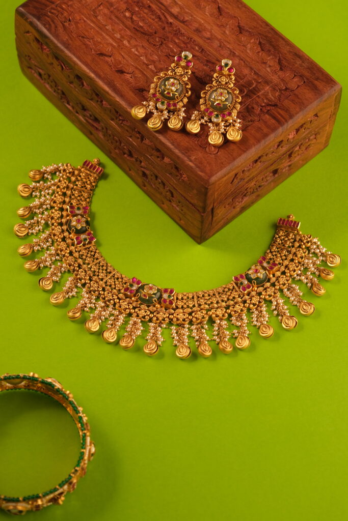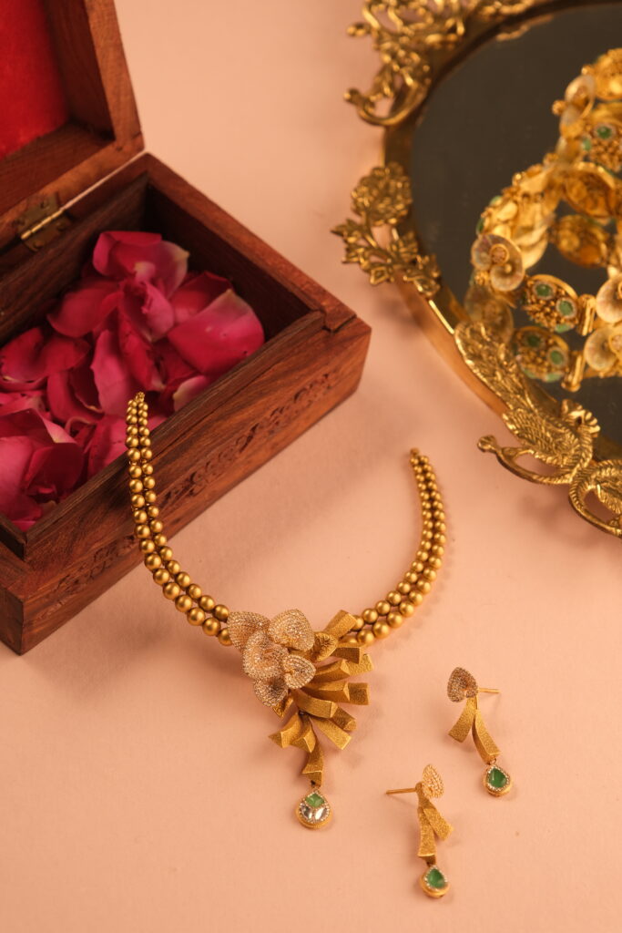 ANTIQUE JAVLIYA SET STUDDED WITH SEMI PRECIOUS STONES AND SECURE SCREW LOCK IN 22 KT GOLD This Antique Javliya Set, meticulously crafted in 22 KT gold, is a stunning blend of timeless elegance and traditional artistry. Known for its regal and vintage appeal, the Javliya Set is an iconic piece of Indian jewelry that adds […]