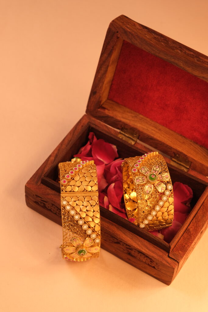 ANTIQUE KADA SET STUDDED WITH SEMI PRECIOUS STONE WITH SCREW LOCK IN 22 KT GOLD This exquisite antique kada is crafted in pure 22 karat gold, featuring a traditional design enhanced with carefully selected semi-precious stones. The intricate detailing showcases timeless craftsmanship, while the secure screw lock ensures a comfortable and firm fit. A perfect […]