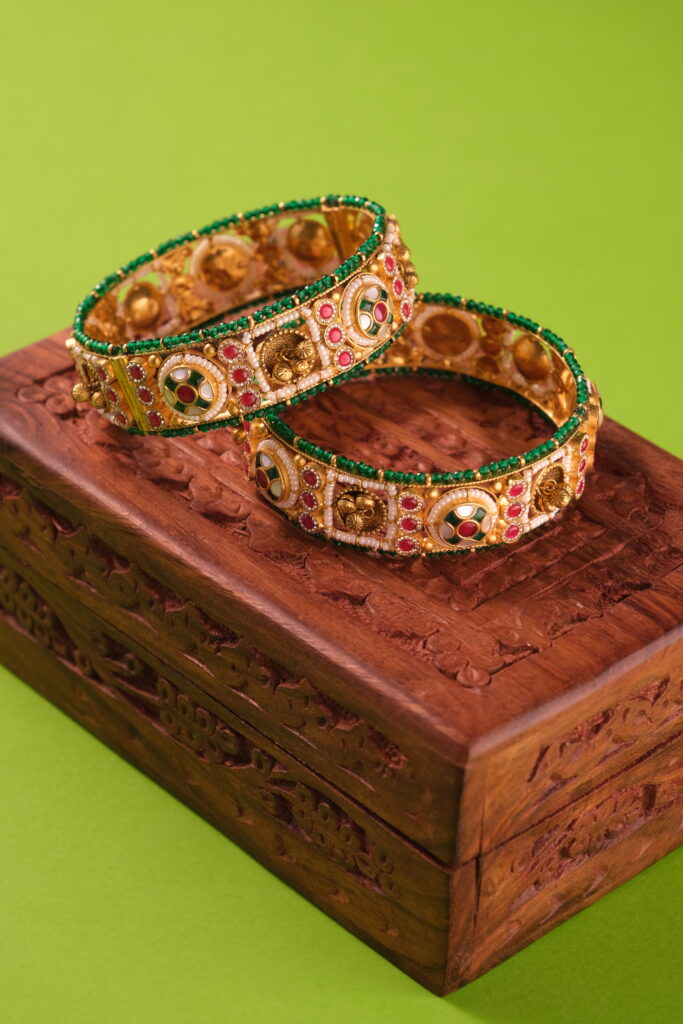 ANTIQUE KADA SET STUDDED WITH SEMI PRECIOUS STONE WITH SCREW LOCK IN 22 KT GOLD This Heritage Style Kada Set, meticulously crafted in 22 KT gold, is a timeless piece that embodies the grace and grandeur of traditional Indian jewelry. Designed for those who appreciate regal elegance, this set features intricate detailing and a perfect […]