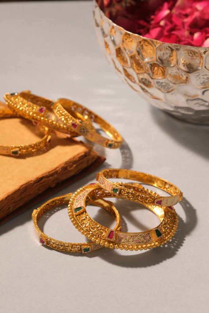 ANTIQUE 6PCS BANGLE SET STUDED WITH SEMI PRECIOUS STONE IN 22KT GOLD The 6-piece antique 22 kt gold bangle set is a stunning collection of traditional Indian bangles, crafted from high-quality 22 karat gold. Each bangle showcases intricate designs, featuring detailed patterns, embossing, and sometimes gemstone embellishments, which add a touch of elegance and sophistication. […]