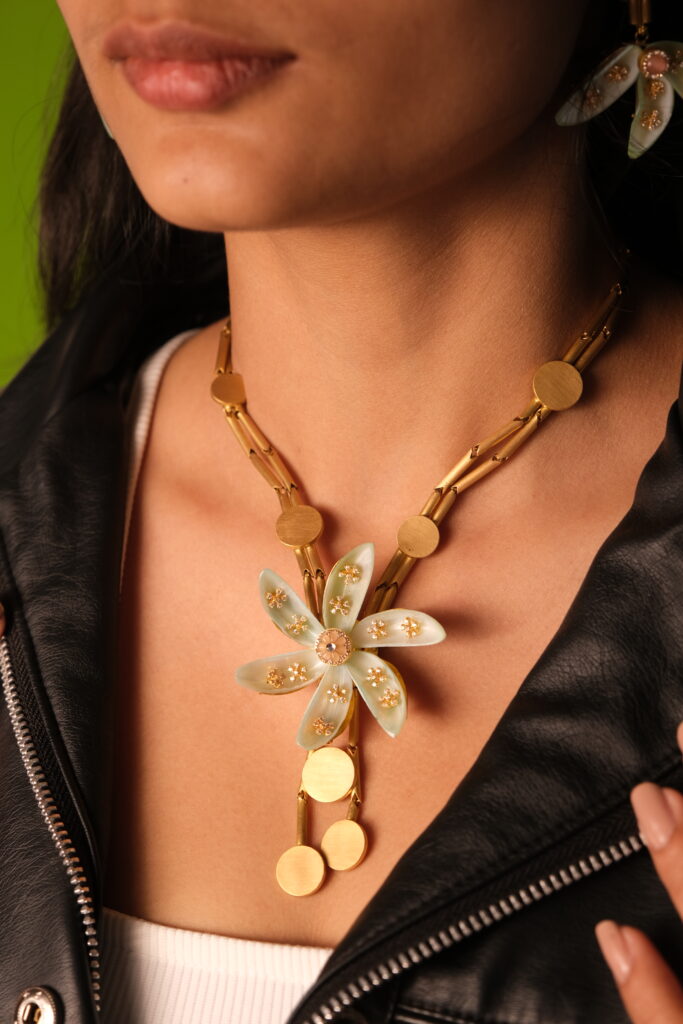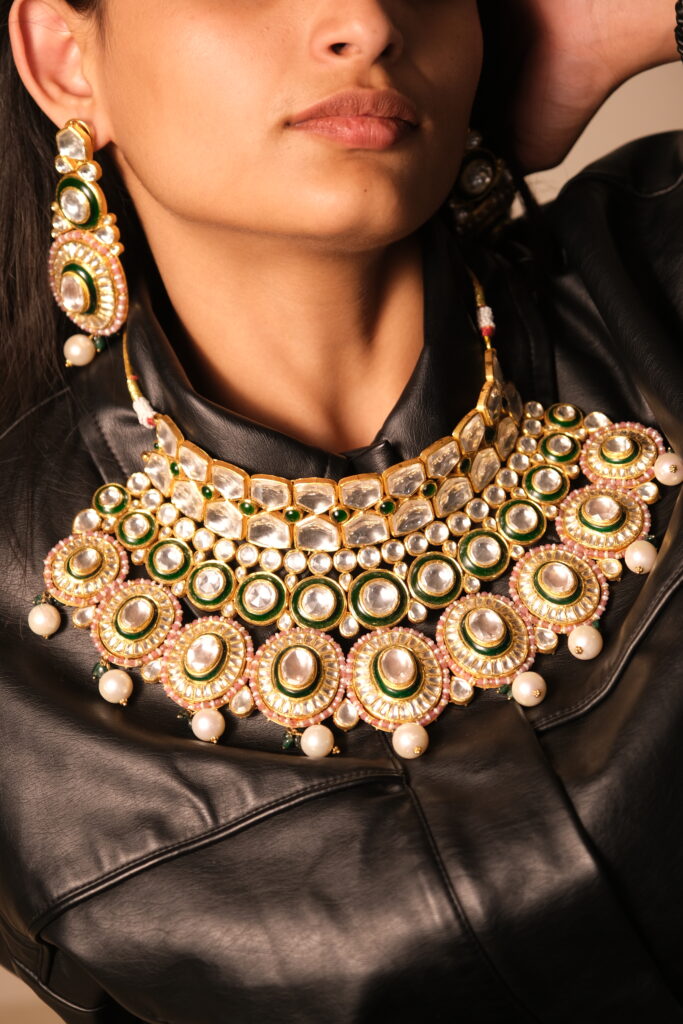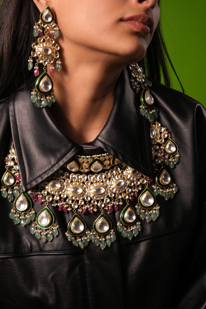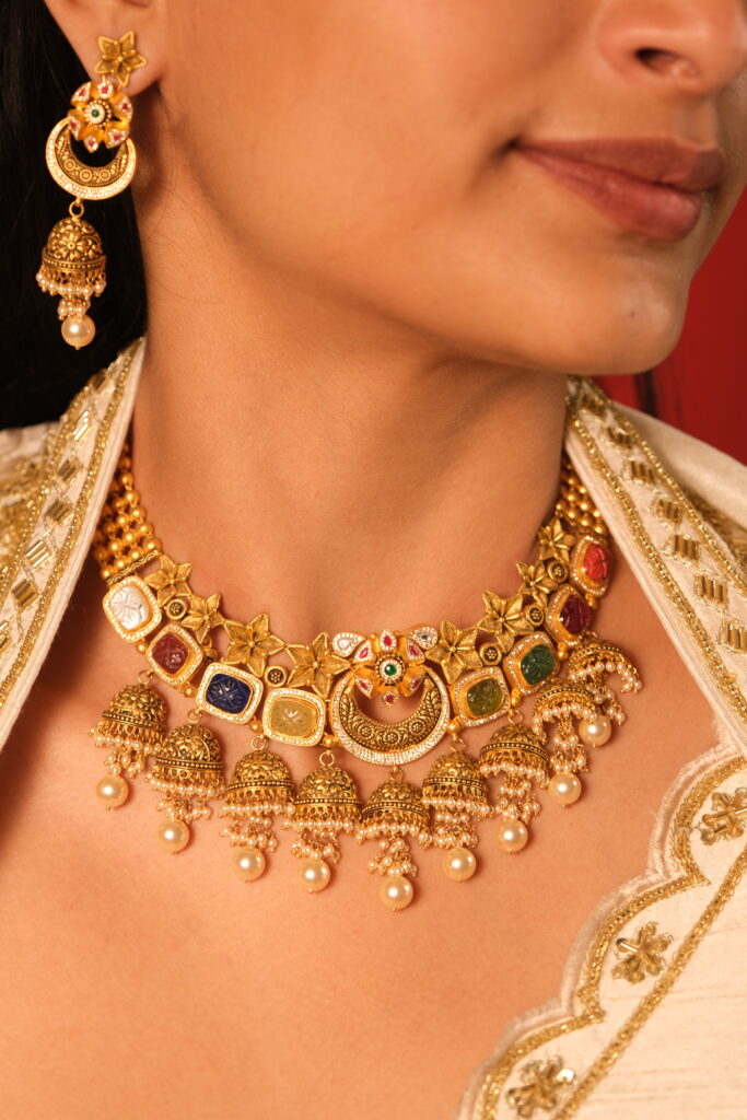 HERITAGE DESIGN HAR SET STUDDED WITH MOZONITE IN 22 KT GOLD This Heritage Design Har Set is a true masterpiece of craftsmanship and luxury, expertly designed in 22 KT gold to reflect timeless elegance and traditional artistry. Combining the allure of vintage design with the richness of modern style, this stunning jewelry set is perfect […]