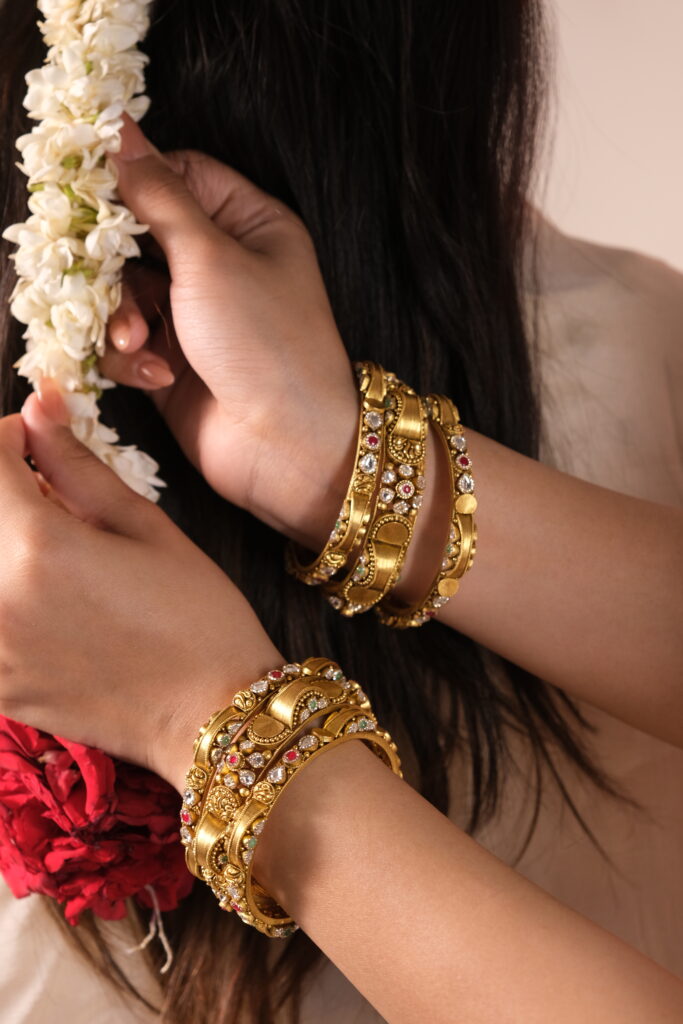 ANTIQUE 6PCS BANGLE SET STUDED WITH SEMI PRECIOUS STONE IN 22KT GOLD The 6-piece antique 22 kt gold bangle set is a stunning collection of traditional Indian bangles, crafted from high-quality 22 karat gold. Each bangle showcases intricate designs, featuring detailed patterns, embossing, and sometimes gemstone embellishments, which add a touch of elegance and sophistication. […]