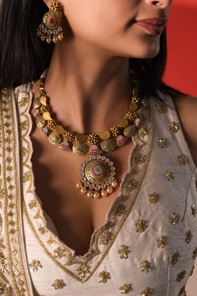 Antique har set with semi precious stones in 22 kt gold This exquisite 22 kt gold antique studded har set showcases a stunning blend of traditional craftsmanship and intricate design. The set features ornate detailing, often with floral or geometric motifs, and is accented with vibrant gemstones or diamonds that enhance its elegance. Ideal for […]