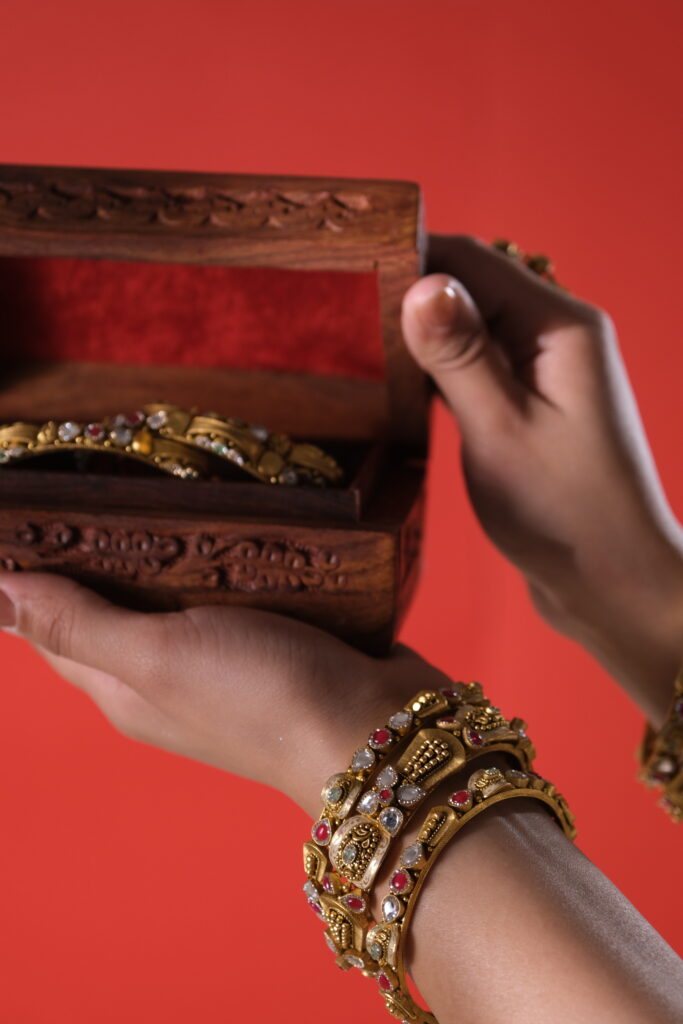 ANTIQUE DOUBLE RING SET ATTACHED WITH CHAIN IN 22 KT GOLD Elegantly crafted in 22 karat gold, this antique double ring set is linked with a delicate gold chain, creating a unique and graceful statement piece. The intricate design reflects timeless tradition, making it a perfect blend of vintage charm and refined craftsmanship. Ideal for […]