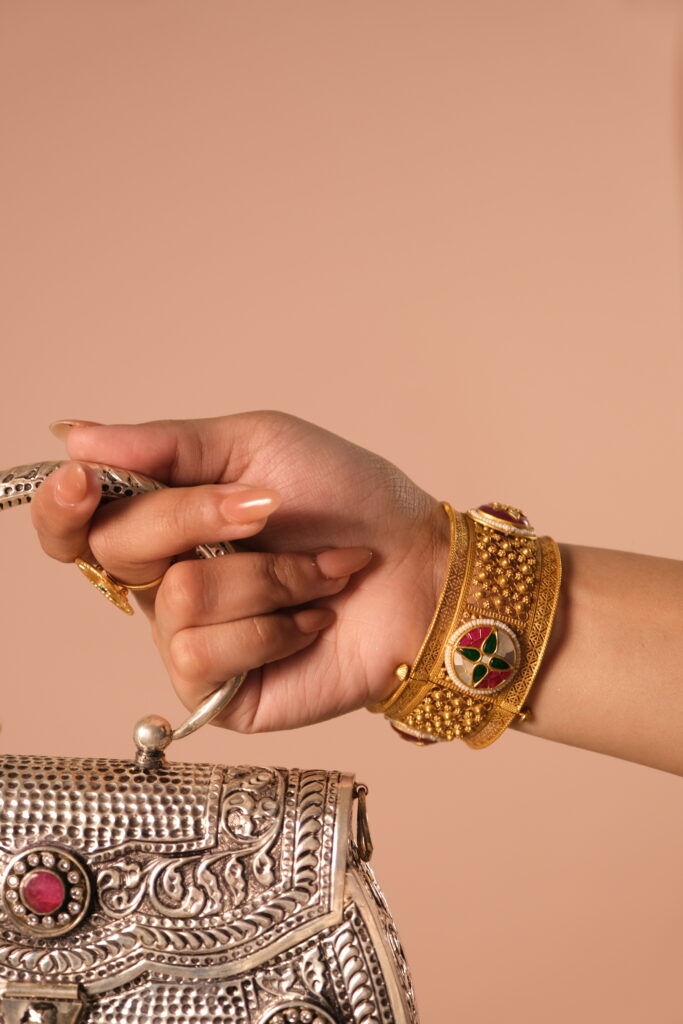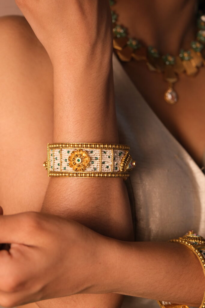 HERITAGE DESIGN KADA SET STUDDED WITH SEMI PRECIOUS STONES AND PEARLS WITH SCREW LOCK IN 22 KT GOLD Heritage Design Kada Set crafted in 22 KT gold, beautifully studded with semi-precious stones and elegant pearls. Featuring a secure screw lock, this timeless set blends traditional artistry with refined elegance. Enquire on WhatsApp You may also […]