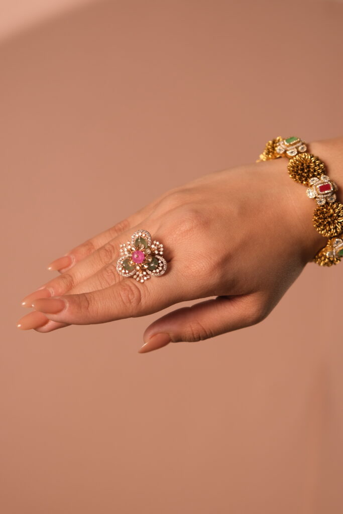 ANTIQUE GOLD RING STUDDED WITH SEMI PRECIOUS STONES IN 22 KT GOLD Antique 22 KT Gold Ring adorned with exquisite semi-precious stones. This timeless piece showcases intricate craftsmanship and vintage charm, making it a unique addition to any fine jewelry collection. Enquire on WhatsApp You may also like